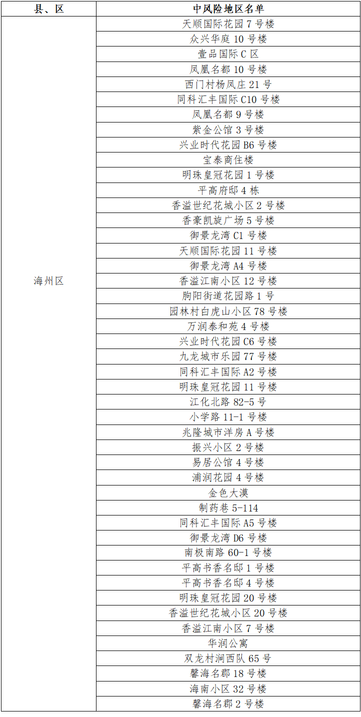 海州區中央華府D1棟、玉蘭國際5號樓、福園名邸3號樓、一品苑44號樓、博威江南明珠苑33號樓、如佳賓館(霞輝路店)、鳳祥銘居7號樓、蒼梧春曉23號樓、龍河小區25號樓、鷹游水岸花園5號樓、海南小區34號樓、仕方國際9號樓、茗馨花園18號樓、梧桐藍山晴園7號樓、富強路疏導點旁三合院、百達菲力酒吧、通灌南路66號3棟、極美公寓4號樓、路南街道河運路35號樓、海連中路151號、興城四號公寓8號樓、青年路55號5棟、東方領秀7號樓、寶翔財富廣場3號樓、園林村白虎山組王莊隊13號、津華苑小區A2號樓、盛世豪庭小區8號樓、許莊村楊圩北隊51號、振興公寓6號樓、建欣路1號樓、園林村白虎山小區100號、路南街道東村巷2號樓、建設中路76-24號由中風險地區調整為低風險地區。