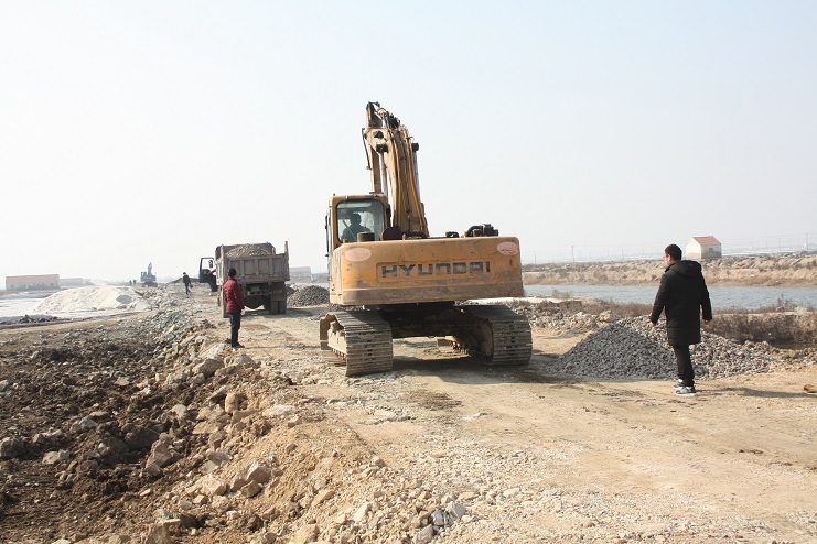 2月15日,在新河制鹽公司七至十班運(yùn)鹽路施工現(xiàn)場,我們看到南翼公司項目工程分公司的員工正在指揮兩臺小型工程車將石子傾倒在路基上,兩臺挖掘機(jī)正忙于將運(yùn)送來的石子整平。運(yùn)鹽河對面,三輛滿載土夾石的大型工程車一字排開,正等待卸載。據(jù)了解,目前正在施工的是新河制鹽分公司二期運(yùn)鹽路維修改造工程,該工程改造路段全長3300米,計劃總投資193萬元,其中路基鋪設(shè)部分由日曬制鹽公司出資45萬元,路面部分則由縣交通局承擔(dān),預(yù)計需要投入148萬元。該工程于去年底開始施工,預(yù)計三月中下旬全部鋪設(shè)完成。另外新河制鹽分公司一期一至十二班3300米運(yùn)鹽路改造工程計劃將于今年下半年實(shí)施。