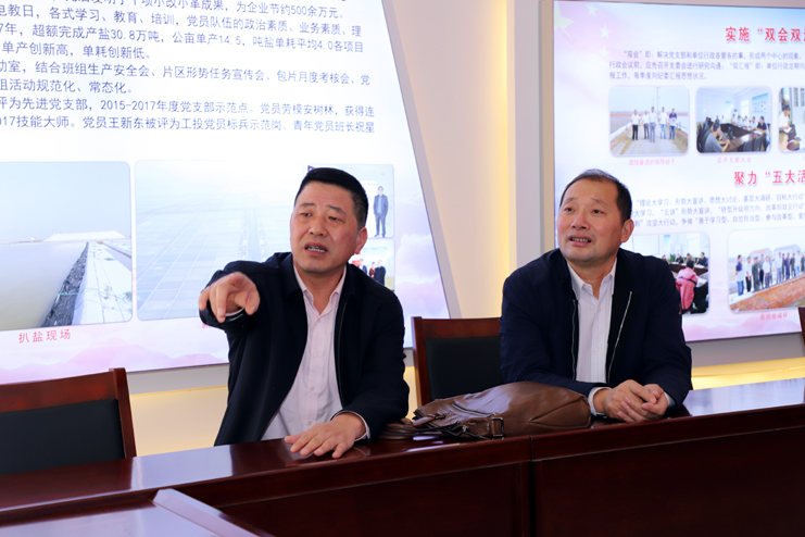 檢查組一行先后到新河制鹽分公司、老機關新建黨建室進行實地檢查驗收,在新河制鹽分公司黨建活動室,江舜軍部長一行詳細聽取了該黨支部書記李加新對黨建工作的匯報,隨后,在老機關綜合黨員活動中心,檢查組一行利用活動室電子顯示屏觀看了集團司歌視頻。