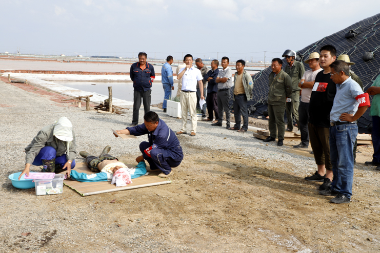 當(dāng)天下午正直高溫天氣,室外環(huán)境悶熱?,F(xiàn)場(chǎng),鹽工孫良成在烈日下工作幾個(gè)小時(shí)后早已汗流浹背,堅(jiān)持工作一段時(shí)間后,感到頭暈?zāi)垦#С植蛔〉乖诹他}池邊上?,F(xiàn)場(chǎng)安全員張軍連第一時(shí)間趕到現(xiàn)場(chǎng),根據(jù)經(jīng)驗(yàn),初步判斷倒地者出現(xiàn)了中暑癥狀。立即組織員工董志波和曹軍華將孫良成抬至陰涼通風(fēng)處,側(cè)臥后仰頭部,保持其呼吸暢通。并解開(kāi)他身上的衣扣,一邊為他扇風(fēng)送涼。大伙一邊用溫濕毛巾不斷為他擦拭身體降溫,一邊喂他服下藿香正氣水,并用清涼油、風(fēng)油精等擦拭額頭位置。在現(xiàn)場(chǎng)急救迅速開(kāi)展的同時(shí),班長(zhǎng)林樹(shù)軍立即向埒南分公司安全負(fù)責(zé)人江躍匯報(bào),江躍到達(dá)現(xiàn)場(chǎng)了解情況并通知公司經(jīng)理?xiàng)钍乇螅瑫r(shí)通知120急救中心,幾分鐘后,120急救人員趕到現(xiàn)場(chǎng),并對(duì)中暑人員進(jìn)行施救,經(jīng)過(guò)緊張有序的急救,患者逐漸蘇醒并初步恢復(fù)神智,抬上救護(hù)車送去醫(yī)院,至此演練結(jié)束。