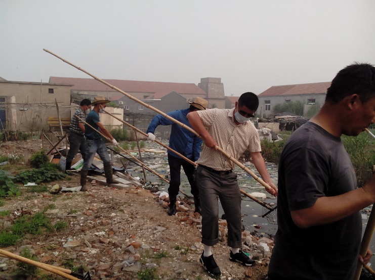 大家早上7點集合后到所在負責片區:化工區家屬區北面的河邊,用耙子打撈河中垃圾。大家不顧高溫天氣、垃圾長期在河中腐蝕的異味,用大耙撈,小耙拉,將河中的垃圾運上來。河中懸浮生長的雜草最難清理,大家齊心協力,用木筏撐著,找繩子拉,經過一上午的忙碌,垃圾被清理了,河道暢通了,為居民創造了整潔的環境,更為雨季到來時河道的排淡能力發揮了較大的作用。