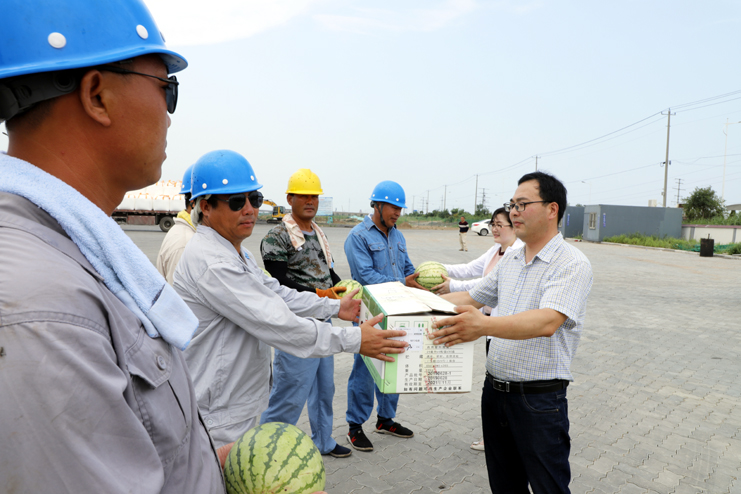 高溫籠罩下的碼頭暑氣蒸騰,灌西工會(huì)為碼頭工人送來(lái)了西瓜、白糖、綠豆、藥品等防暑降溫物品。并叮囑職工們要注意安全生產(chǎn),做好防暑降溫工作。(張明建)