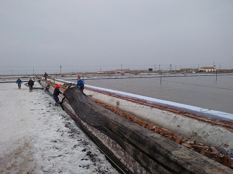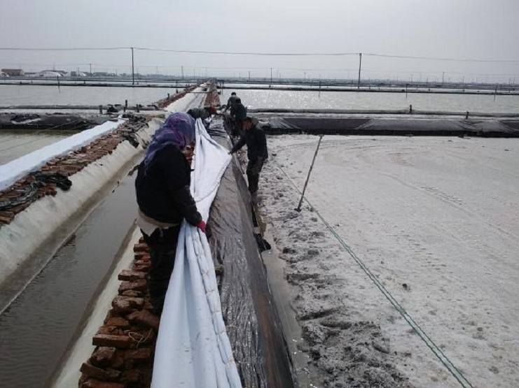 新河制鹽分公司為了盡快改善食用鹽基地面貌,減少池埝上固化紅磚風化,沙塵落入鹽池內,對池鹽的污染,近期組織分公司職工,對基地塑池的紅磚固化池埝進行處理,先用黑塑布把池埝重包一遍,然后再用土工布苫好。有效地減少了雜物落入池鹽中,為產合格食用鹽提供了良好生產環境。(圖為職工們正在苫蓋紅磚固化池埝。)