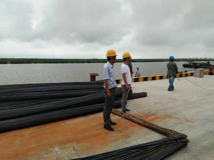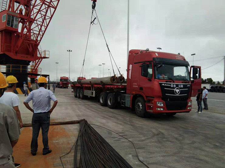 7月17日上午,宵洋物流碼頭迎來(lái)了兩艘滿(mǎn)載著管樁的貨船,佇立在岸上,望著滿(mǎn)載貨物的兩艘船,我心生疑慮——如此長(zhǎng)的管樁如何從船中取出?