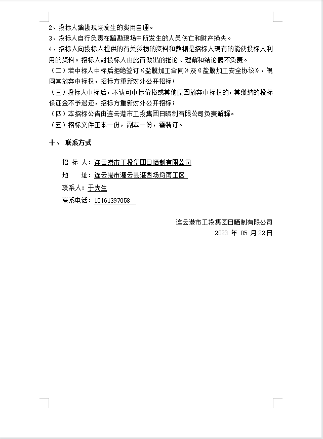 連云港市工投集團日曬制鹽有限公司鹽膜壓合加工招標公告(二次)