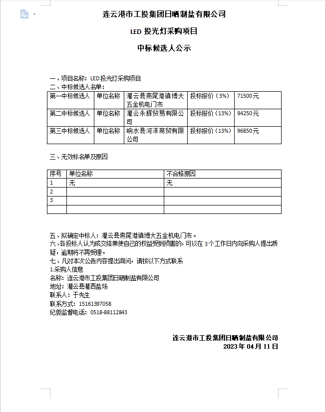 連云港市工投集團日曬制鹽有限公司LED投光燈采購項目中標候選人公示