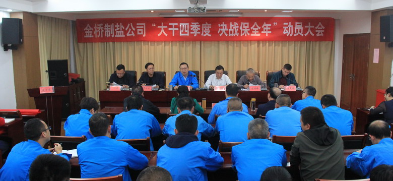 會上,副總經理惠志明作了《20191-9月份經濟活動分析》。然后,副總經理曹開明宣讀了《2019年大干四季度勞動競賽意見》。接著,董事長、黨委書記、總經理朱桂玉作了動員講話。最后,加工鹽車間、包裝鹽車間、品種鹽分公司進行表態發言。
