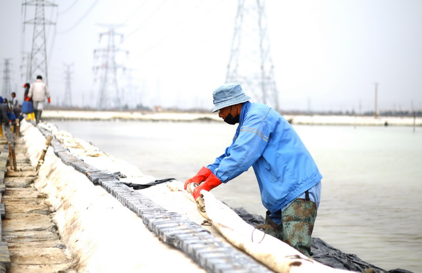 ? ? ? ??首先來(lái)到海州灣公司大浦班組。這里是公司礦鹵復(fù)產(chǎn)工作重點(diǎn)班組,職工們正在整理結(jié)晶池、搶修塑苫布。據(jù)海州灣公司負(fù)責(zé)人劉天義現(xiàn)場(chǎng)介紹,由于前期審批、采購(gòu)等原因,加之突發(fā)的新冠肺炎疫情,結(jié)晶池塑苫布沒能及時(shí)更新,預(yù)報(bào)25日有明顯降雨過(guò)程,海州灣廣大職工因地制宜,收舊利廢,積極備戰(zhàn)大雨天時(shí)。