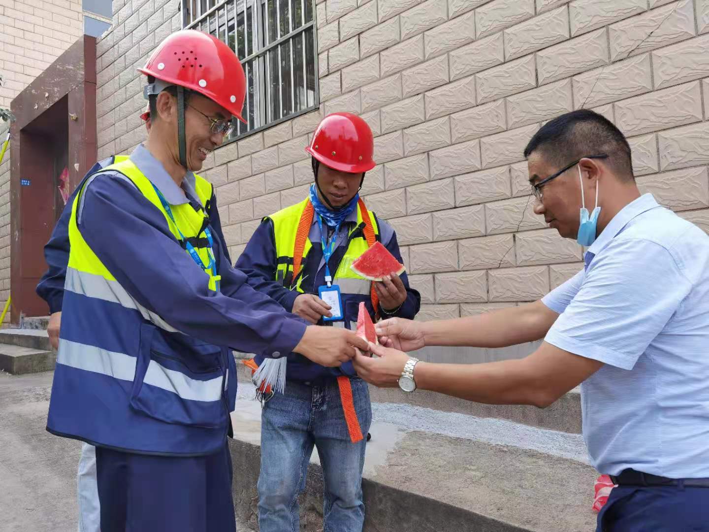 8月19日下午,翔立分公司工會(huì)為奮戰(zhàn)在移動(dòng)線纜整理第一線的職工送去西瓜,為他們帶來(lái)組織的關(guān)懷,在炎炎夏日送上絲絲涼意。為完成今年下達(dá)的目標(biāo)經(jīng)營(yíng)任務(wù),通信各小分隊(duì)的成員不懼高溫“烤驗(yàn)”,全力以赴堅(jiān)守在工作第一線。路邊瓜香彌漫,讓這個(gè)夏天不再炎熱。