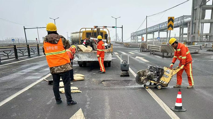 ? ? ? 連日來,為了保障新區道路平穩暢通,市政分公司組織專業力量,分組開展坑洞修補。市政維修人員加班加點先后對港前大道徐新路、海濱大道、石化區陬山路等重點道路大小坑塘30余處破損部位進行修補